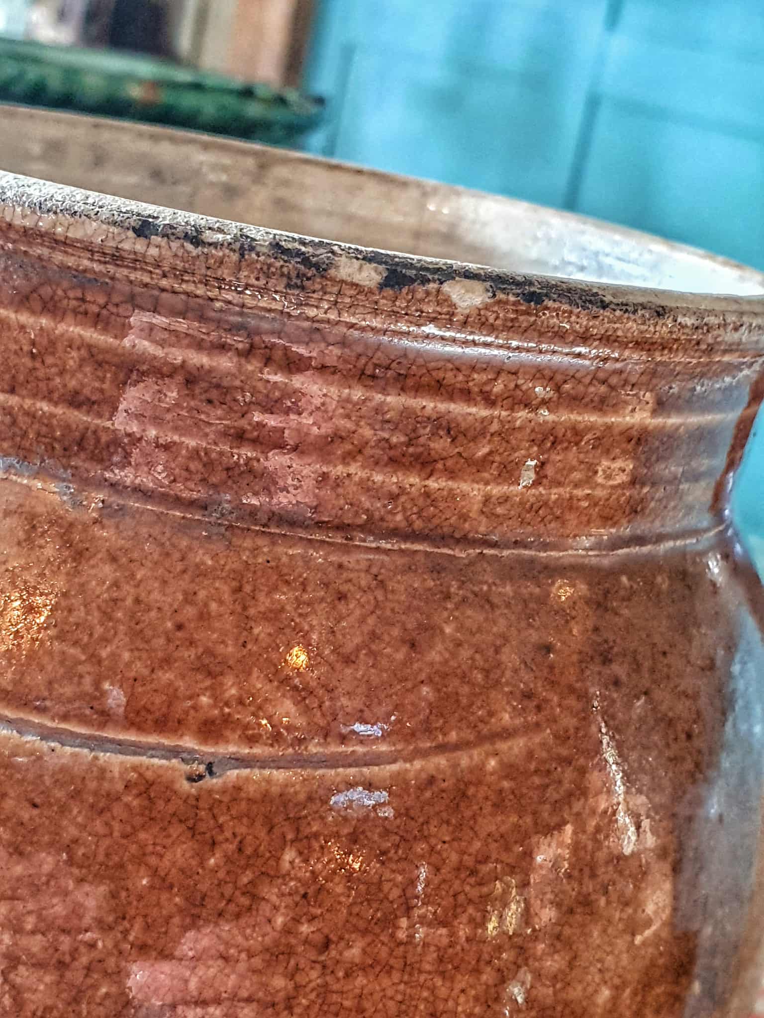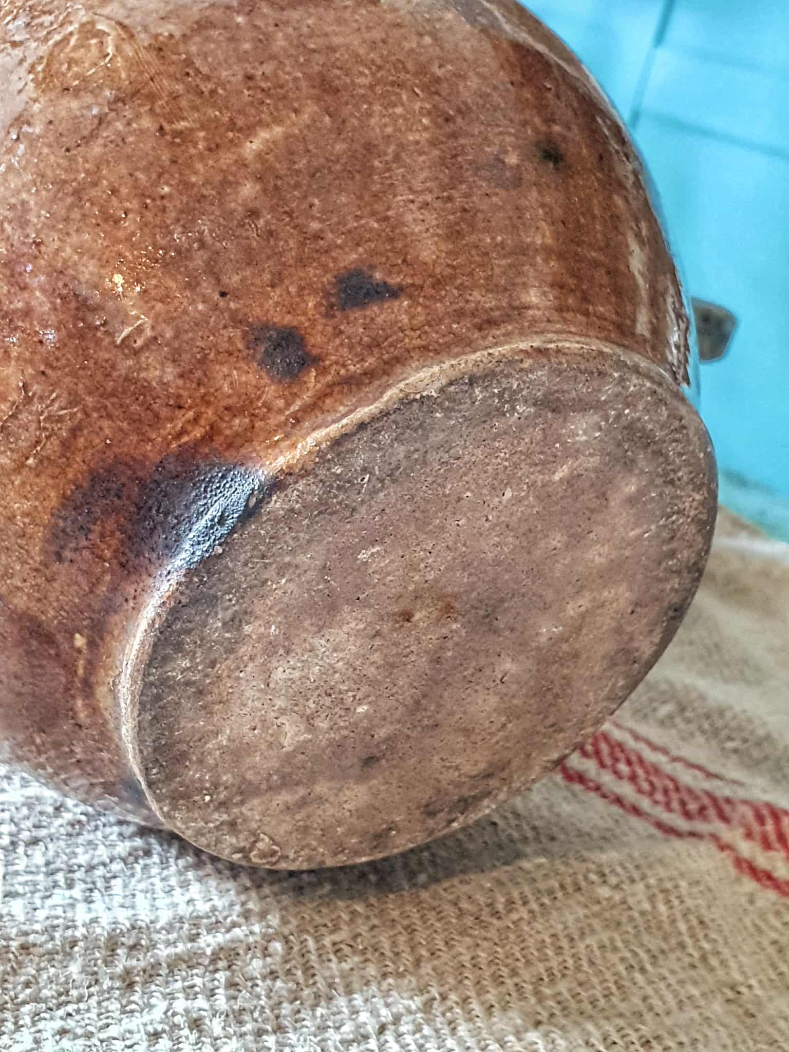It is beautifully weathered, with a light Toffee glaze on the exterior and a soft cream glaze on the interior. The genuine character is accented by light-coloured glaze drips and some charming old soot and burn marks, showing its authentic use over an open fire.